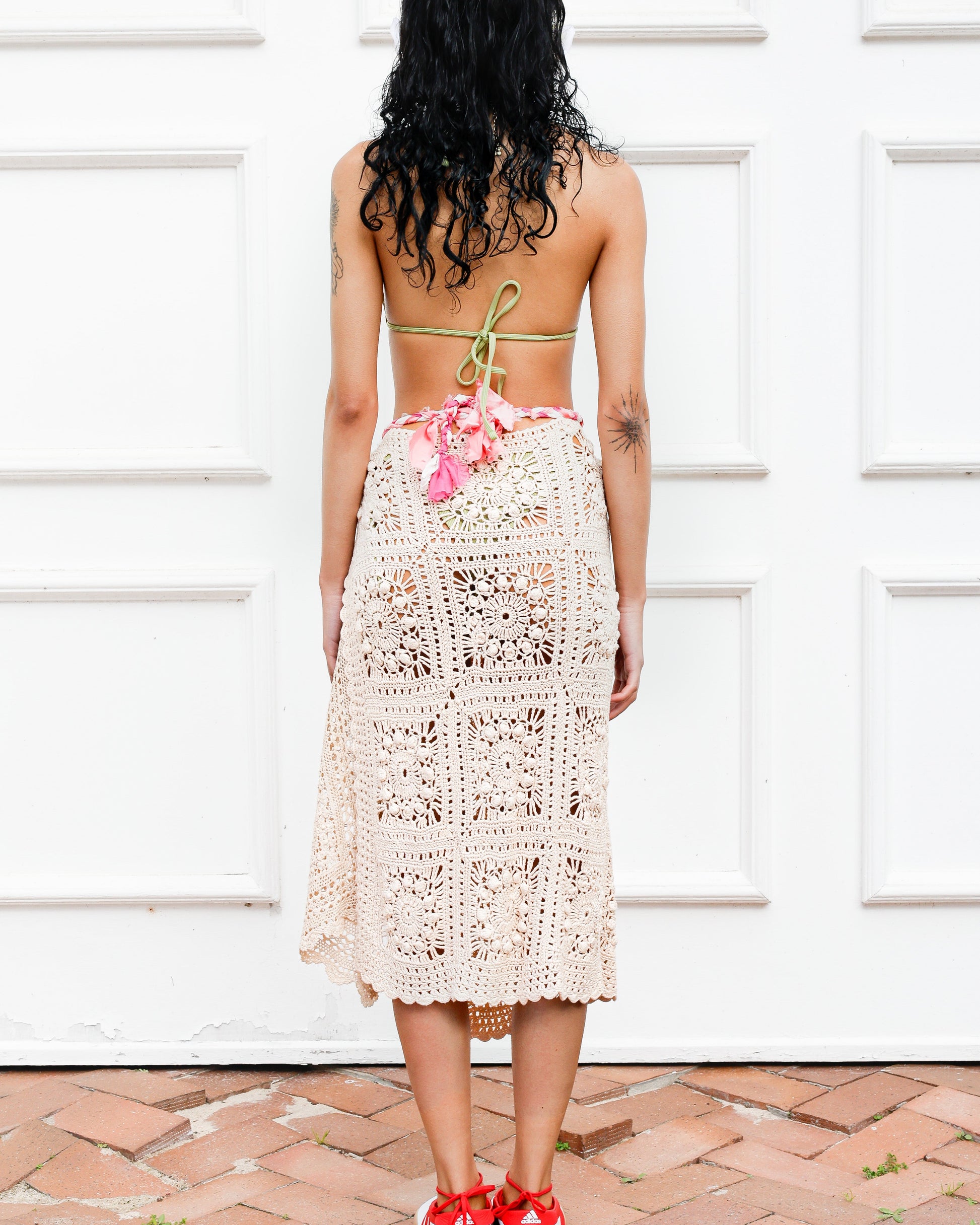 Add a touch of sunshine to your style with ALOHA GLOW. This effortlessly chic wrap skirt features a beaded crochet flower and ties with soft silk scrap fabric. Perfect for brightening any outfit while celebrating sustainability and creativity in every detail.