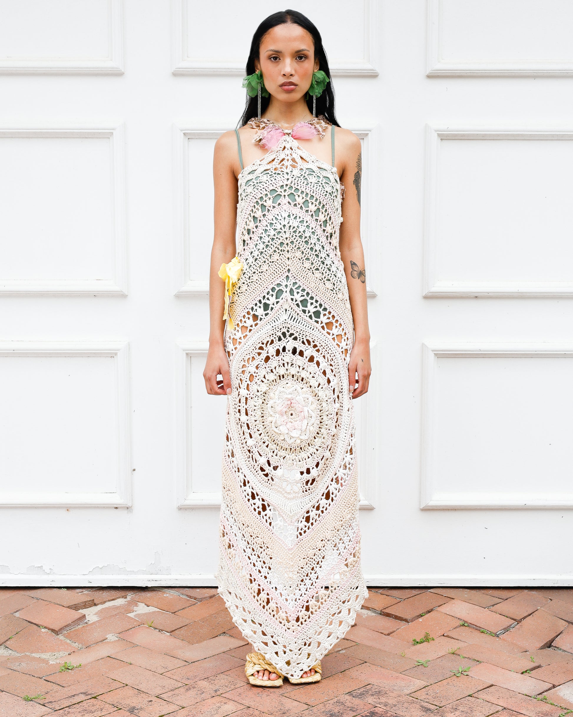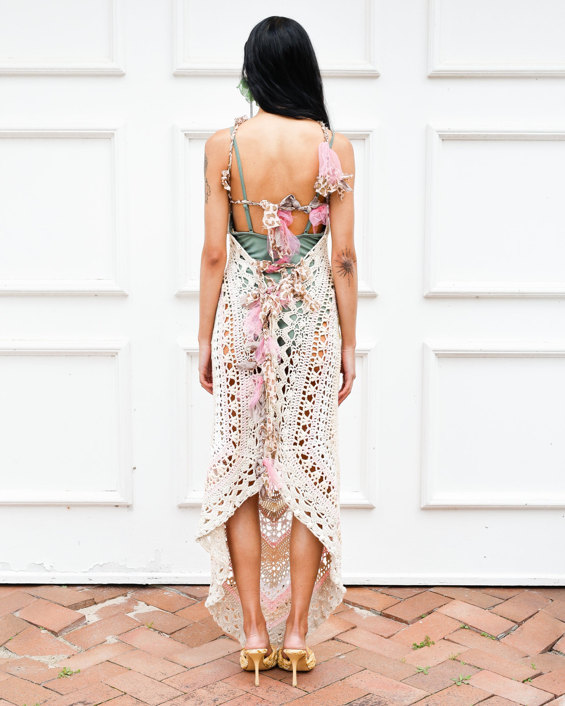 Introducing the 'Candy baby' upcycled dress. Featuring a halter neck, low back and finished with delicate silk scrap fabric ties. Dreamy pastel textures that add a whimsical touch to your wardrobe, perfect to wear over a bodysuit or swimsuit for an effortlessly stylish look.