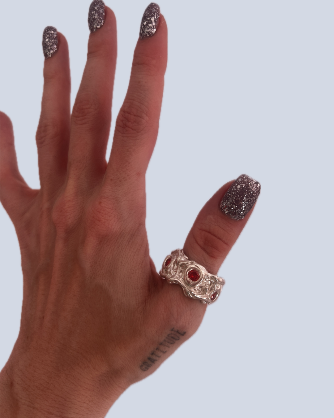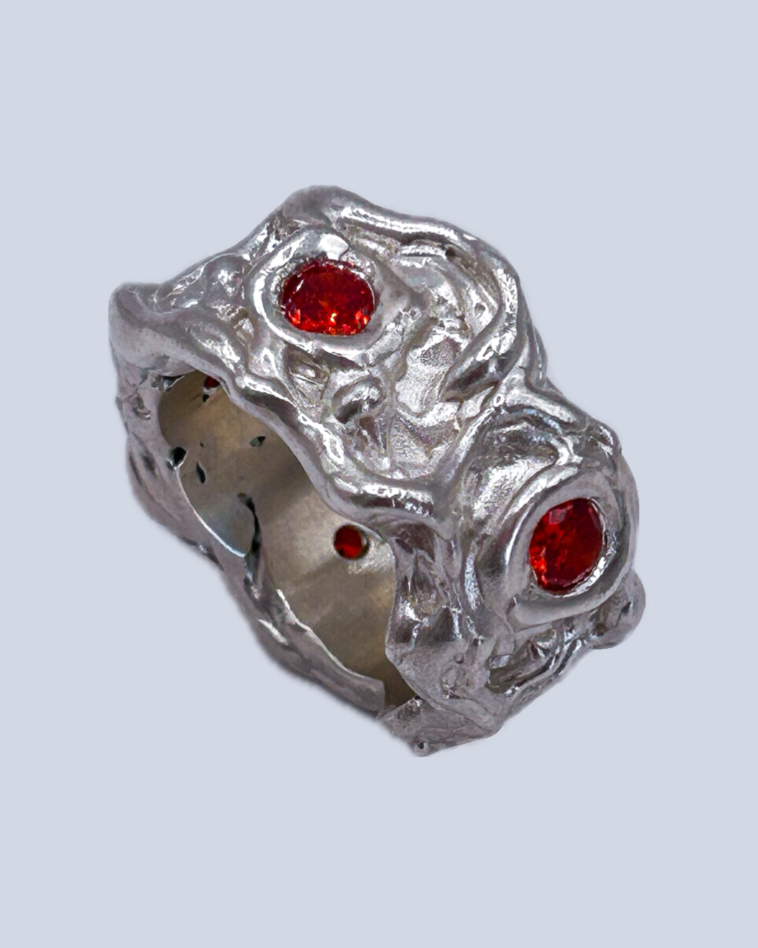 A fiery twist on silver. This sculpted, molten-like band feels alive, with smooth curves and organic edges that mimic flowing metal. Five vibrant orange cubic zirconia stones sit like sparks along the surface, catching the light and adding a burst of warmth. Bold, sculptural, and full of energy- a staple piece you'll never want to take off.