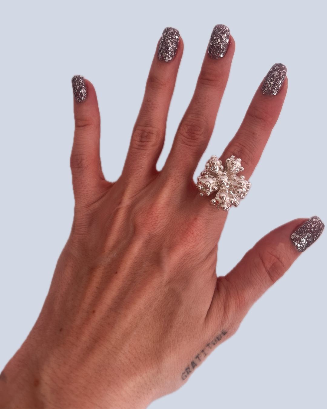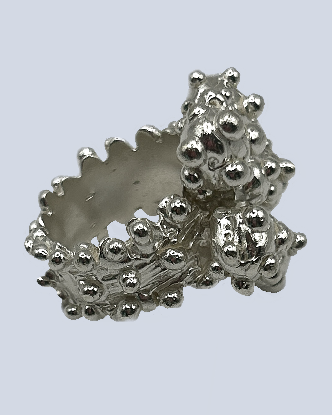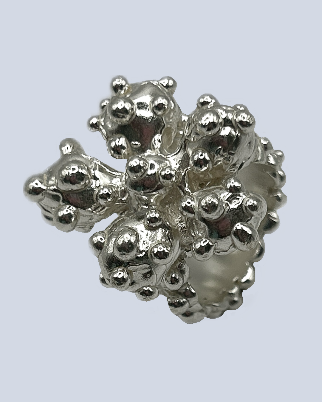 This solid sterling silver ring blooms with a single sculpted flower at its heart, while molten-like droplets scatter right the way around like morning dew. Its chunky silhouette feels both organic and bold- an untamed piece that catches the light and refuses to be delicate.