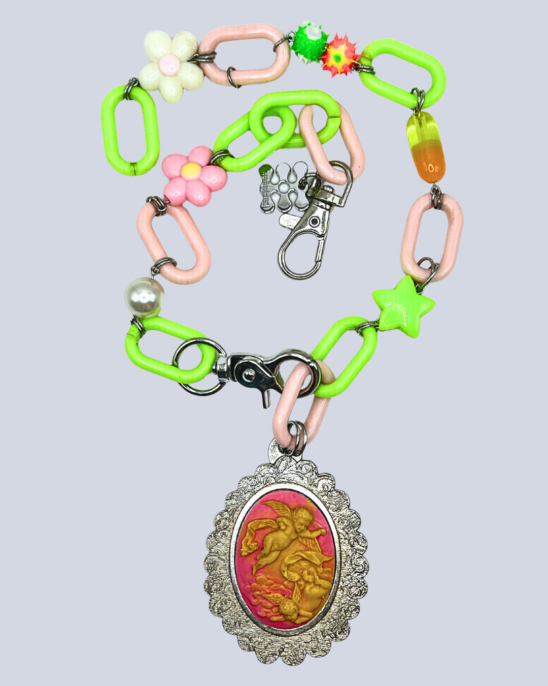 A statement piece that demands attention! Featuring a chunky cherub vintage pendant, quirky accents and individually sealed resin links for extra durability.