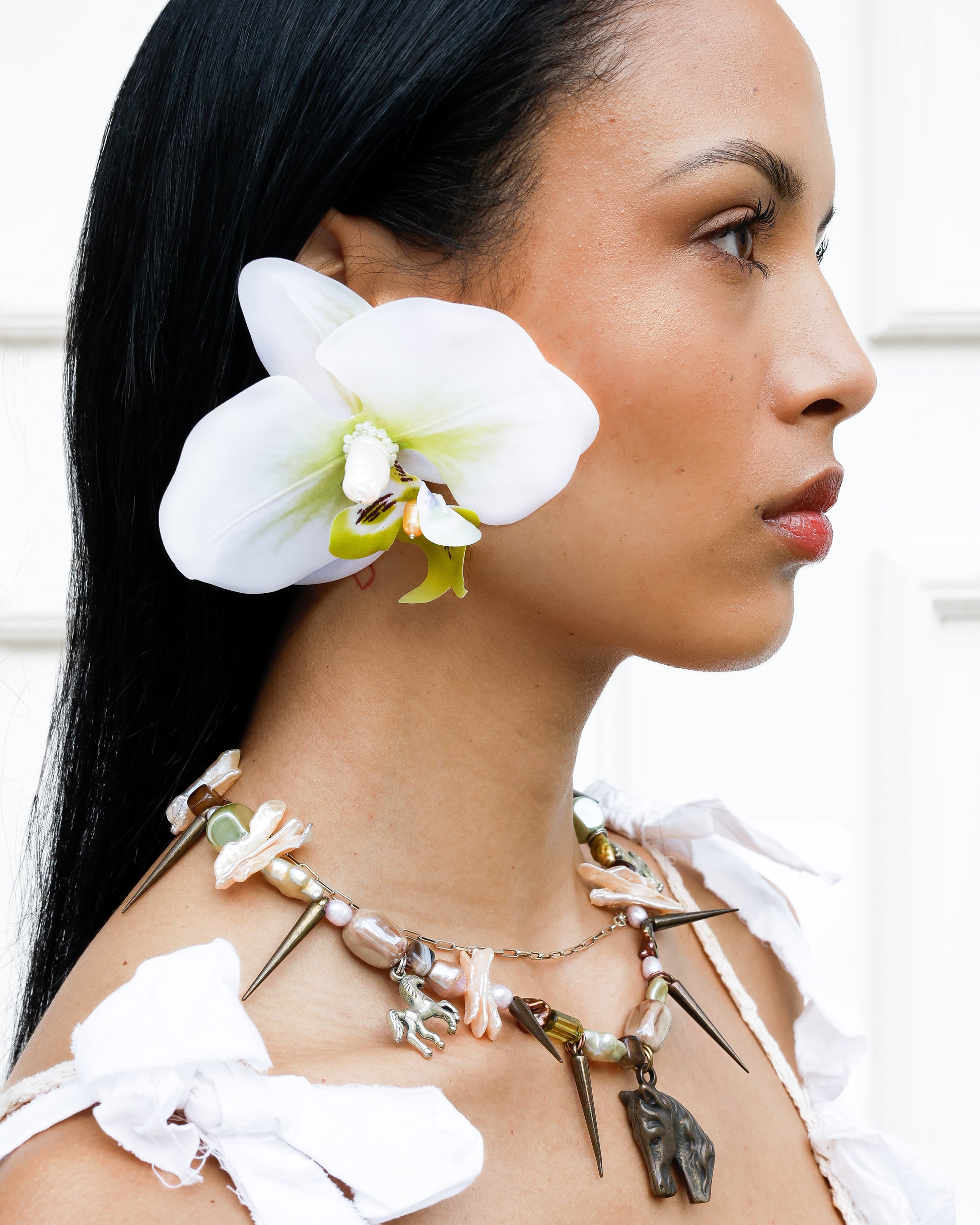 GOLDEN CARRIAGE is for the horse girlies, a dazzling one-of-a-kind piece. Made with fresh water pearls and upcycled materials that gleam in a stunning metallic palette.
