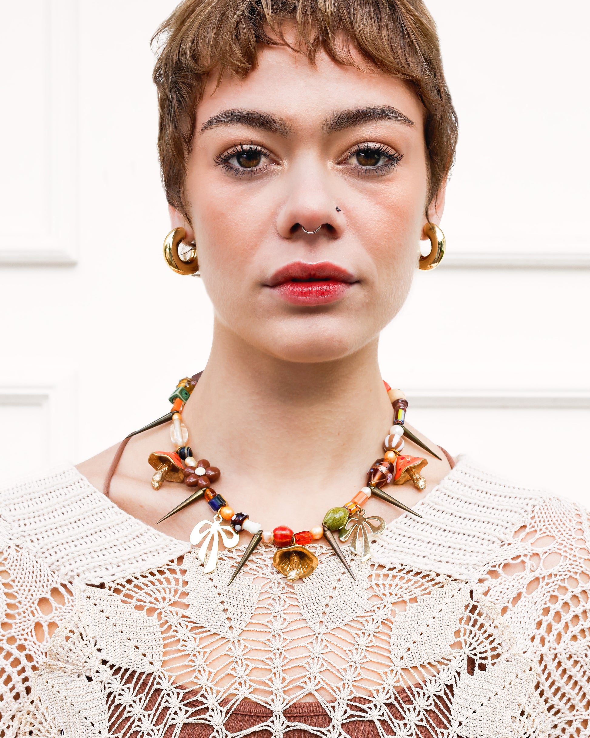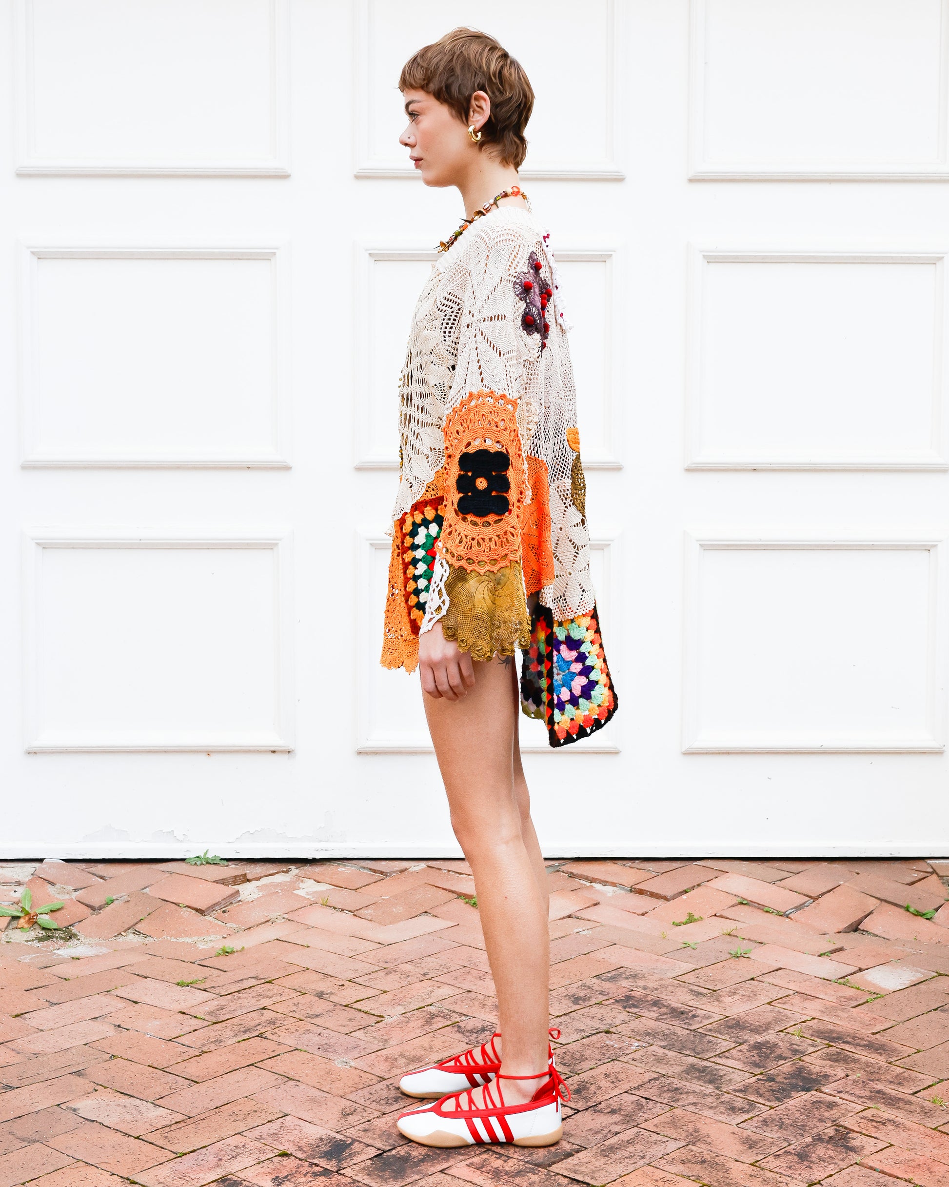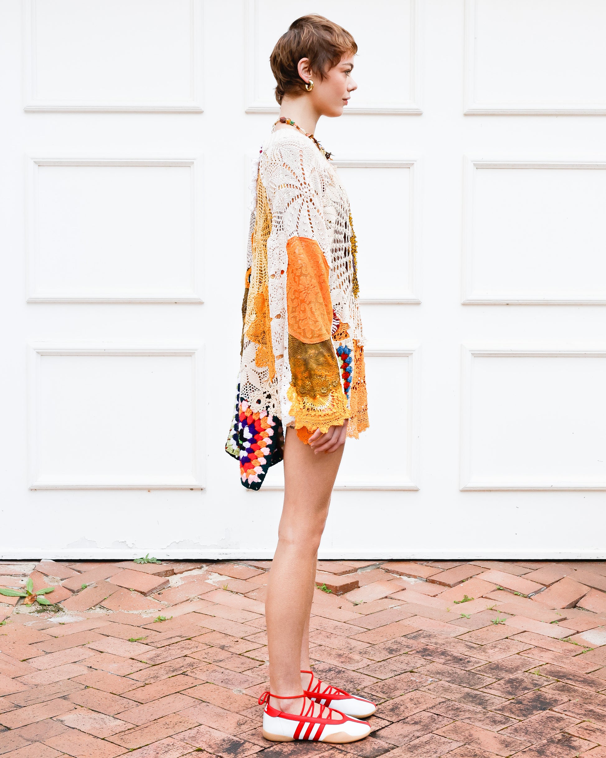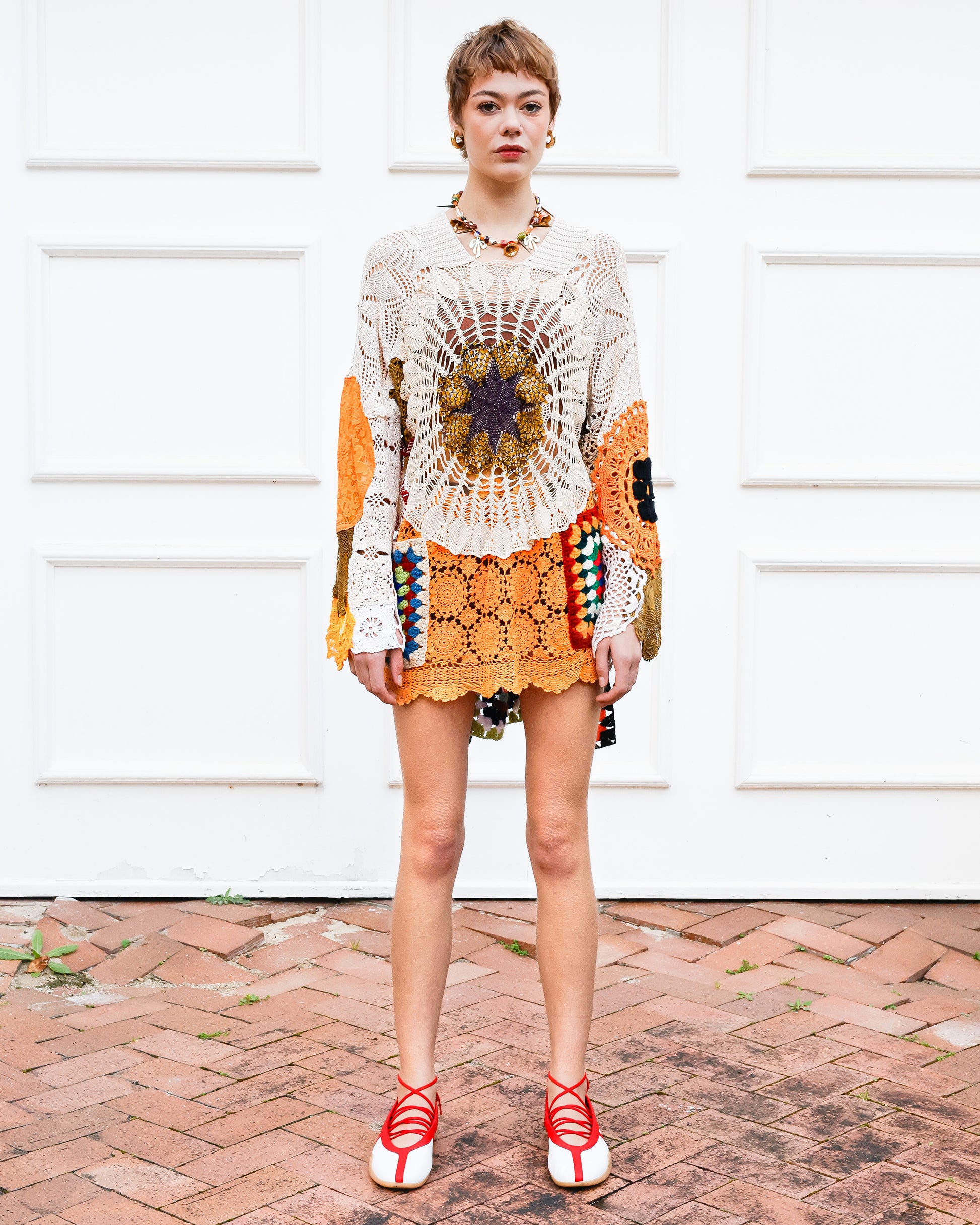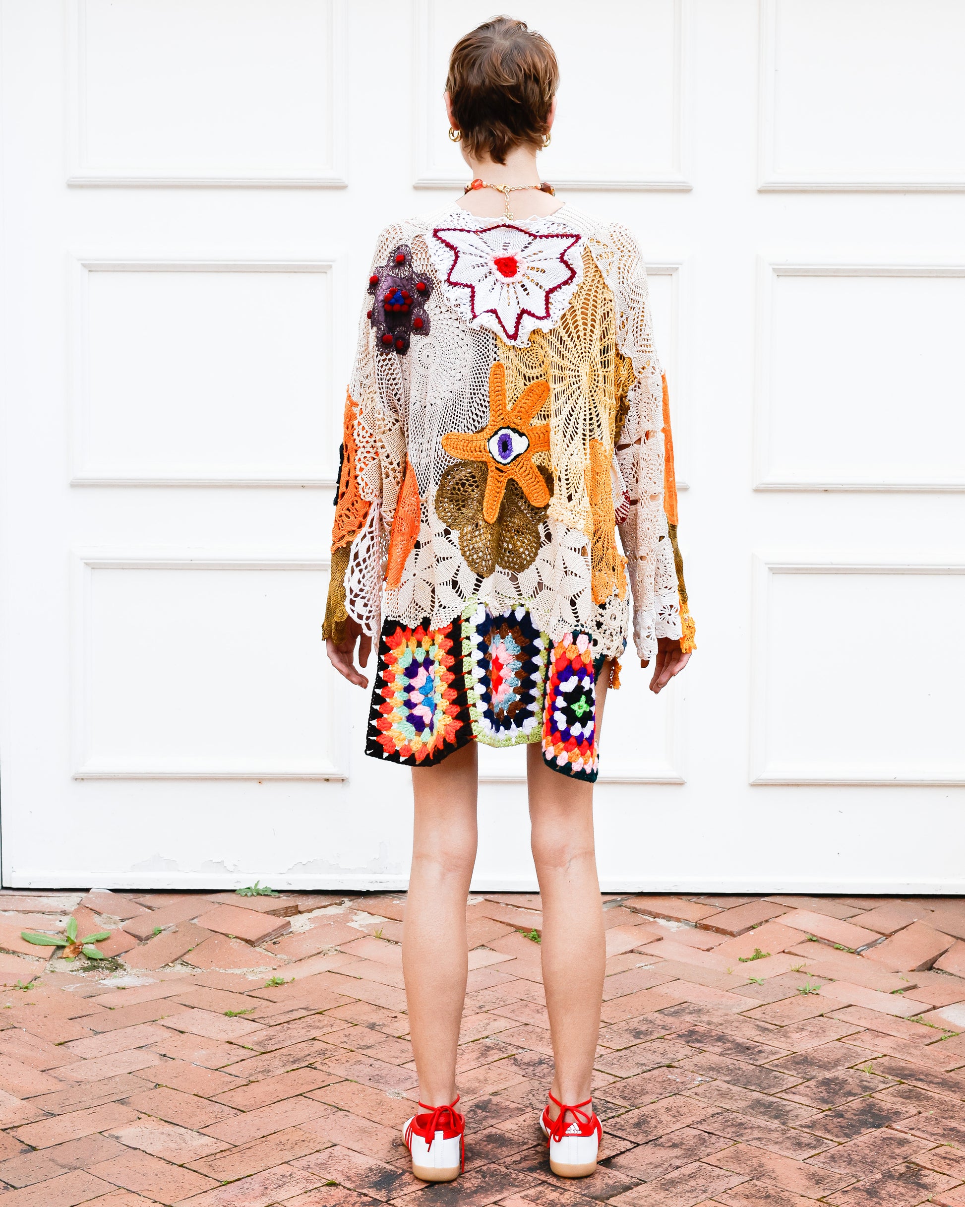 This dreamy, floaty top is a true labour of love, crafted with care by Emily, her mom, and her beloved late granny Sissy. The Golden Sun top is designed to be an easy-wear statement piece that effortlessly draws attention and sparks delightful conversations wherever you go. Made with upcycled and hand dyed crochet, uniquely embellished and finished off with a knitted neck band for comfort and contemporary flair. Embrace its unique charm and let your style shine!