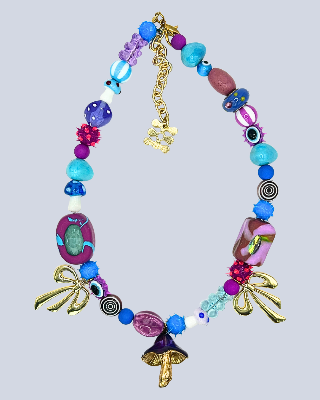 Meet your new favorite necklace – the Indigo Effect! This playful piece balances a charming mushroom pendant with bows and handmade clay beads on either side. Swirling in rich purples and blues, it's a color combo that feels both moody and magical.