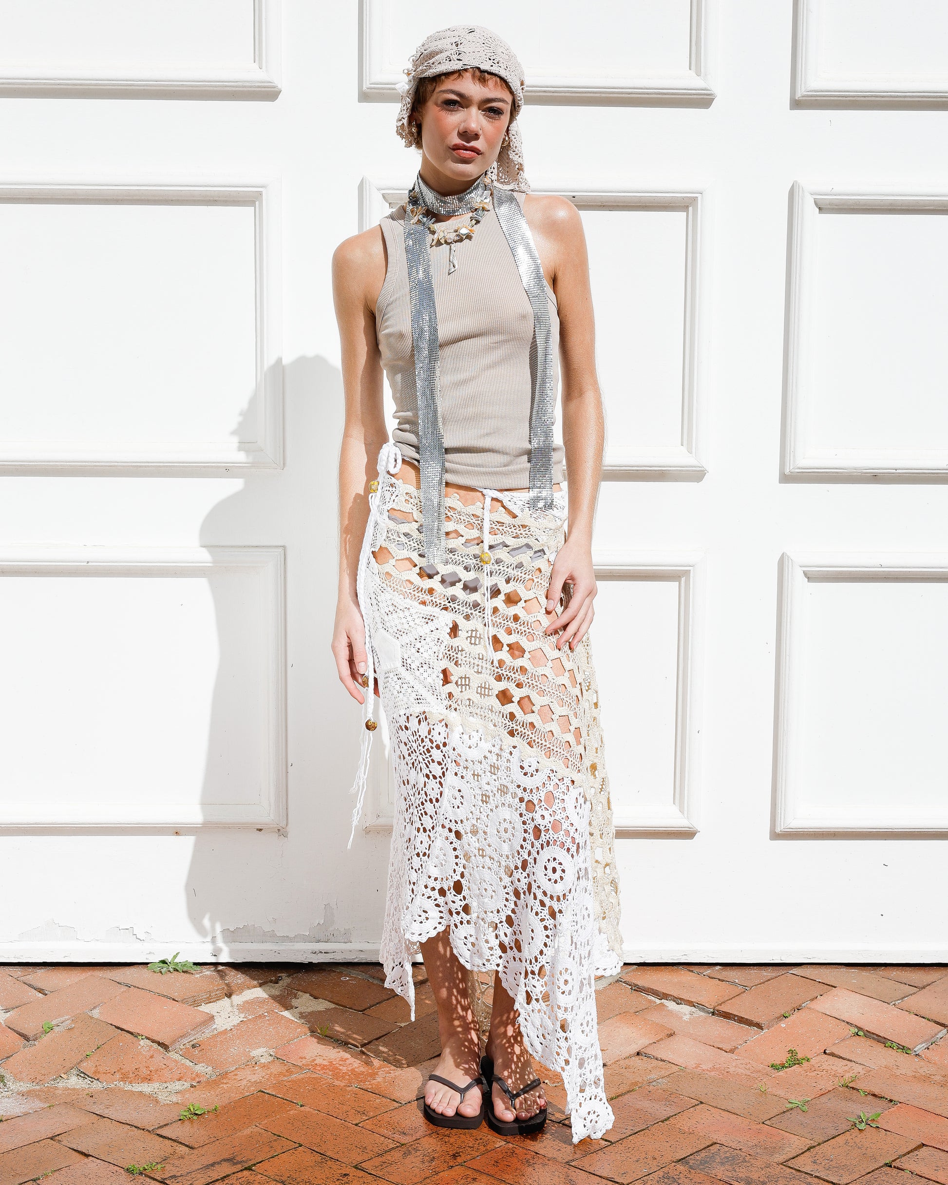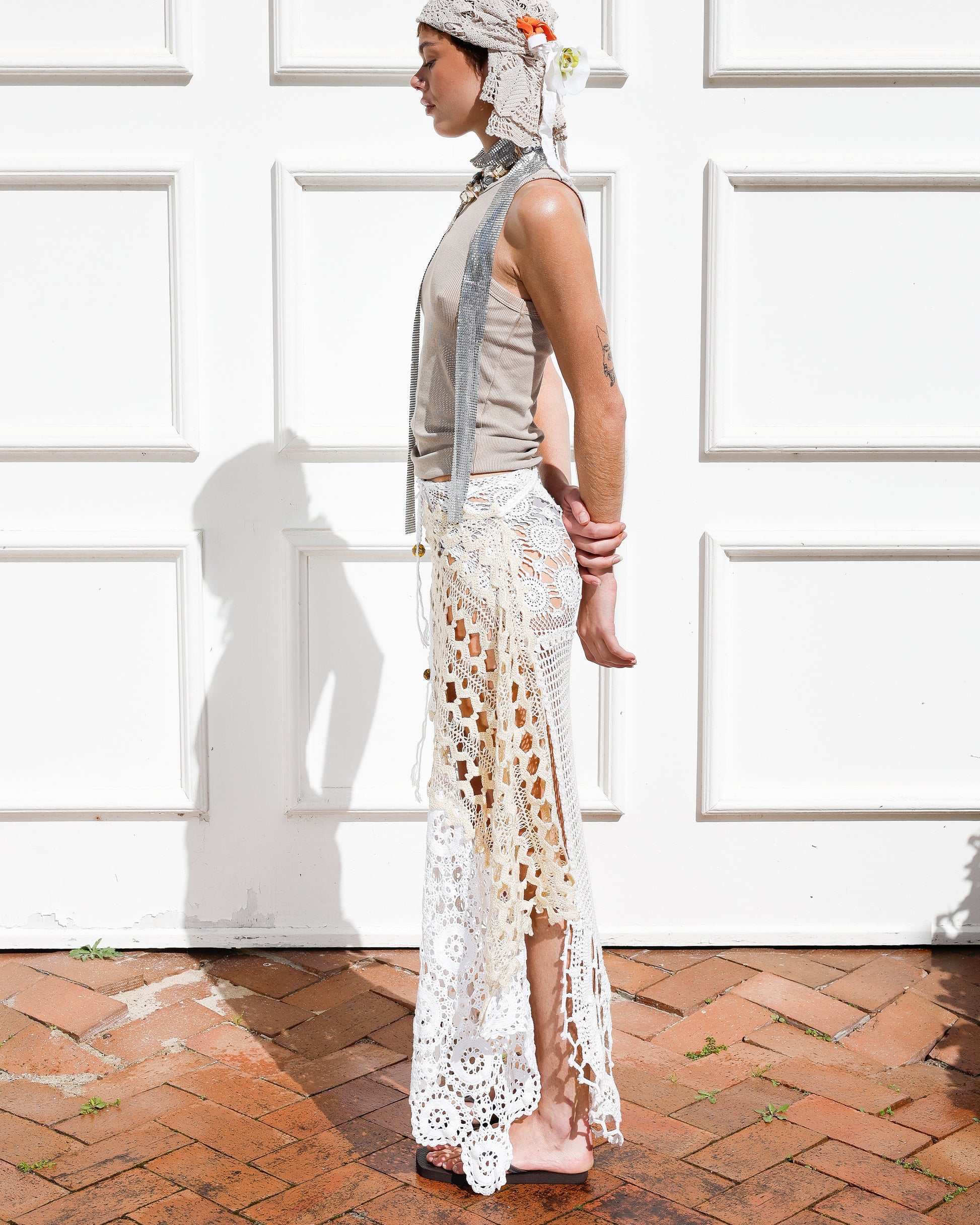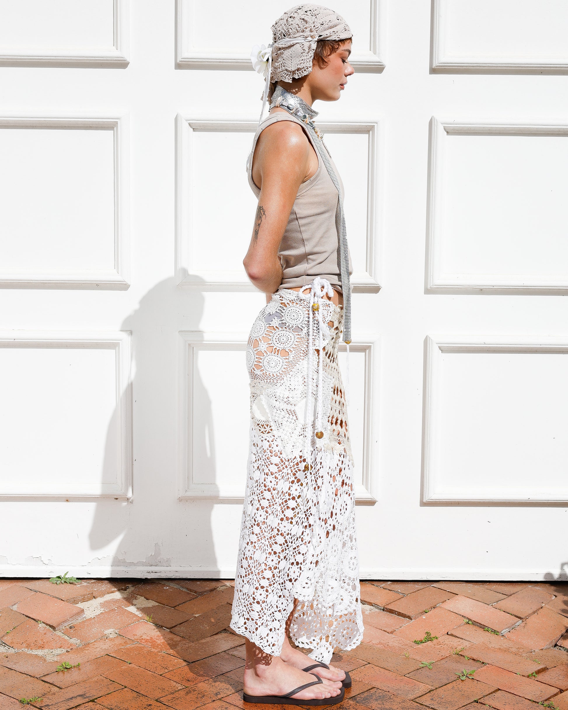 The IVORY DRIFT upcycled crochet wrap skirt is dreamy, versatile, and effortlessly chic. Perfect for your summer wardrobe. It can also be layered over your favorite outfits to add texture and dimension, making every look uniquely yours.