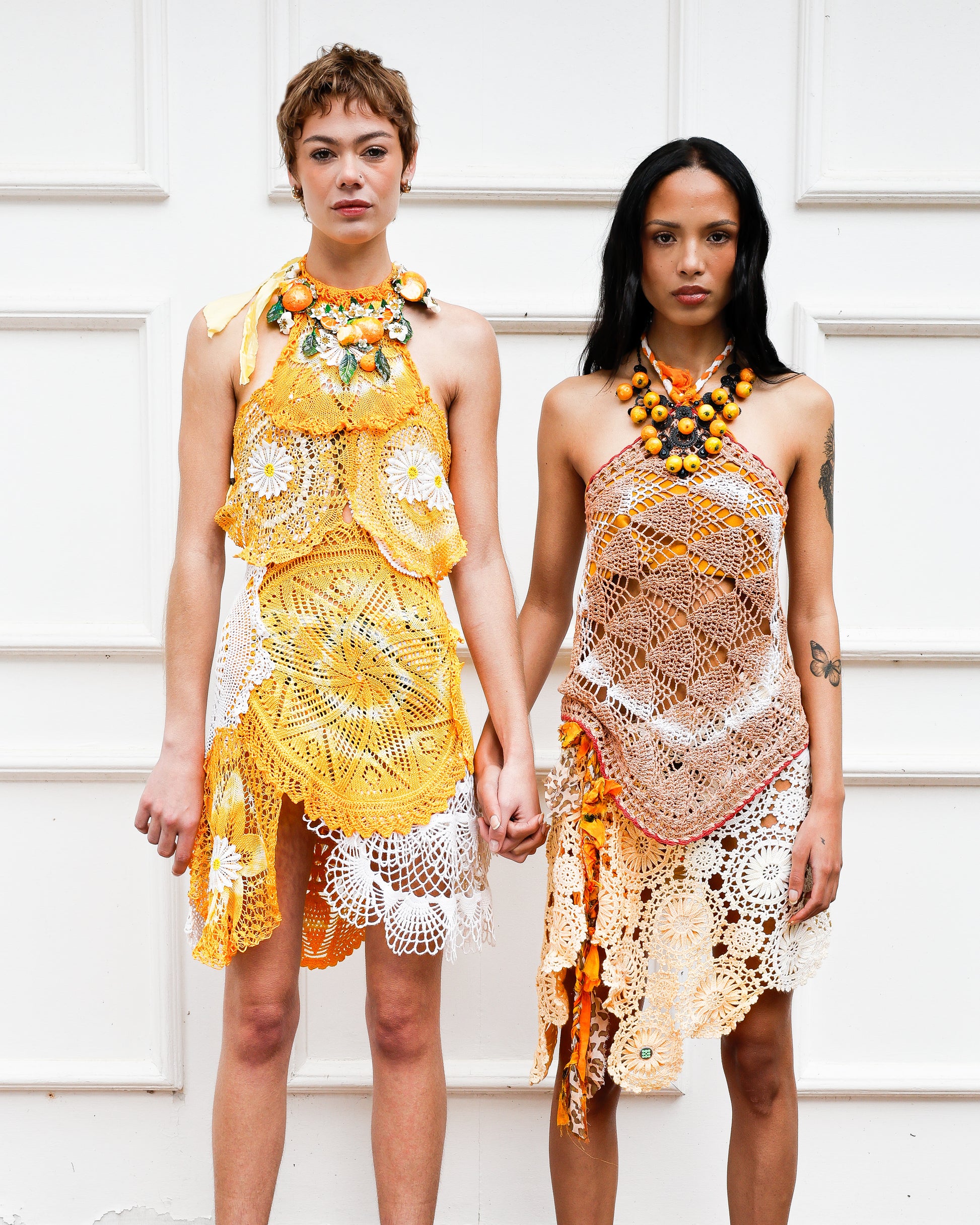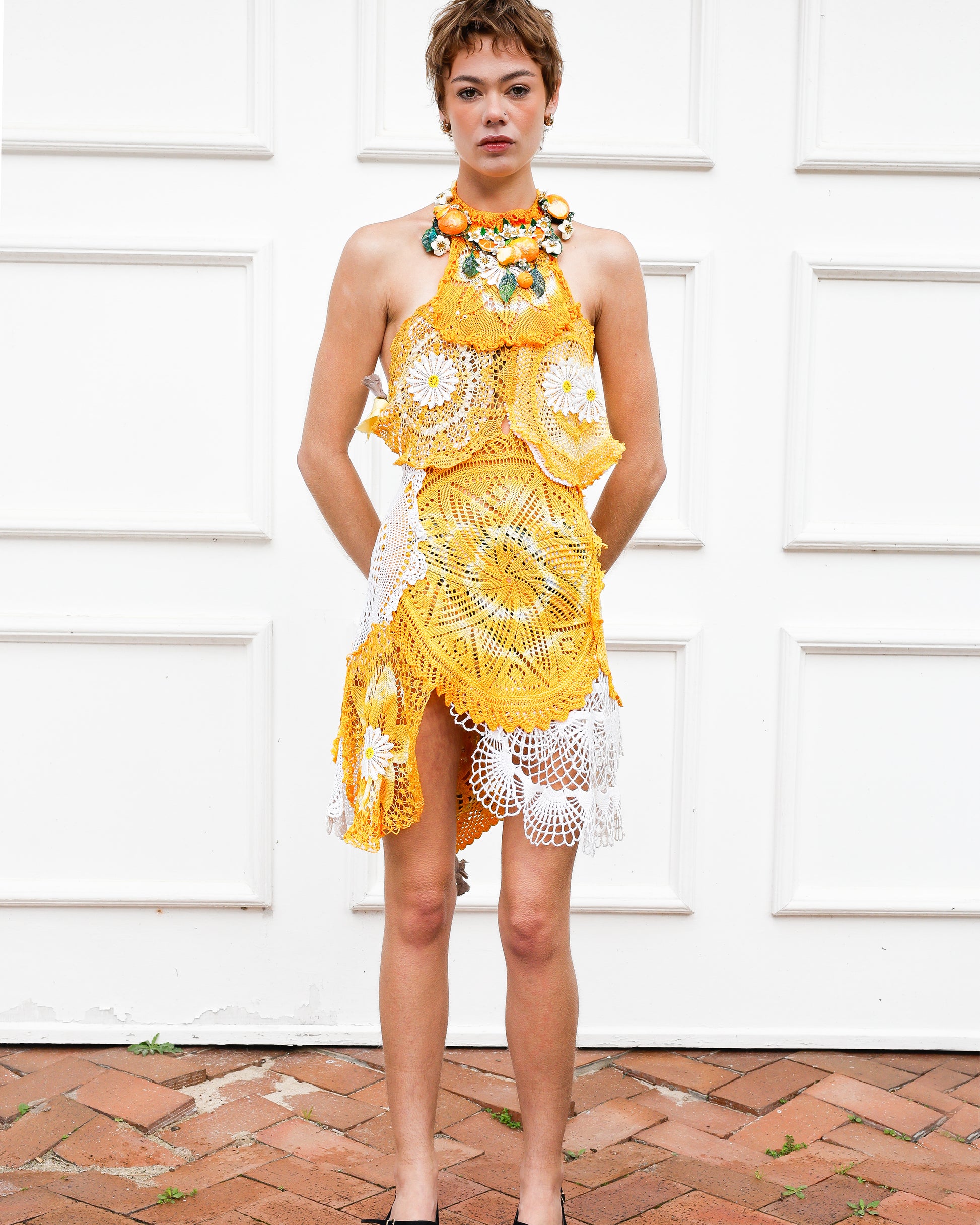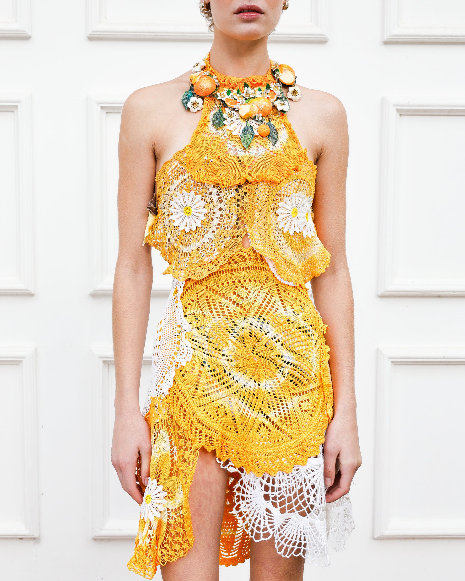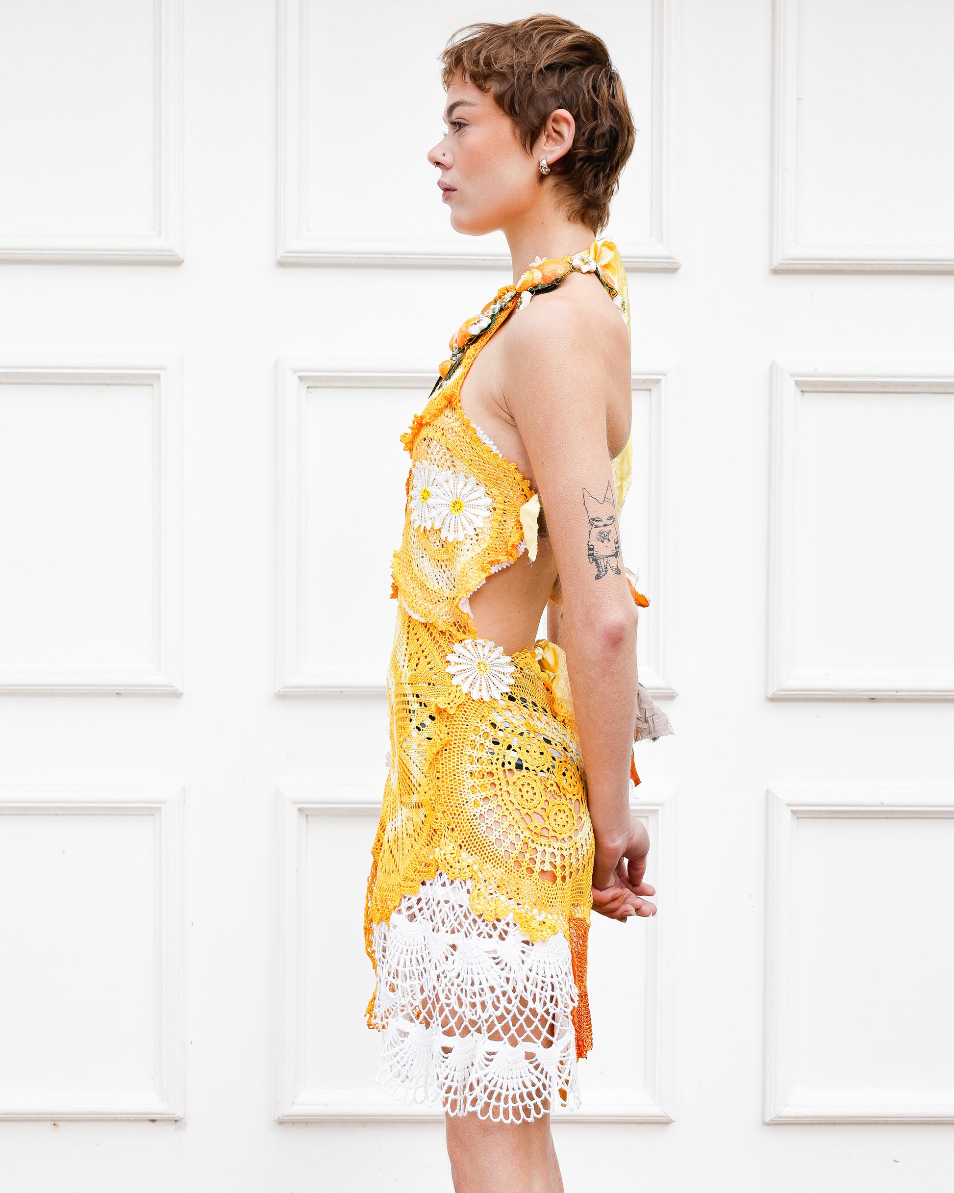 The Lemon Squeeze dress is a playful celebration of color and texture, crafted from upcycled tie-dye crochet in sunny yellow and crisp white. Floaty and light, it features delicate white flowers and silk scrap fabric ties, making it a vibrant, dreamy choice for carefree days.