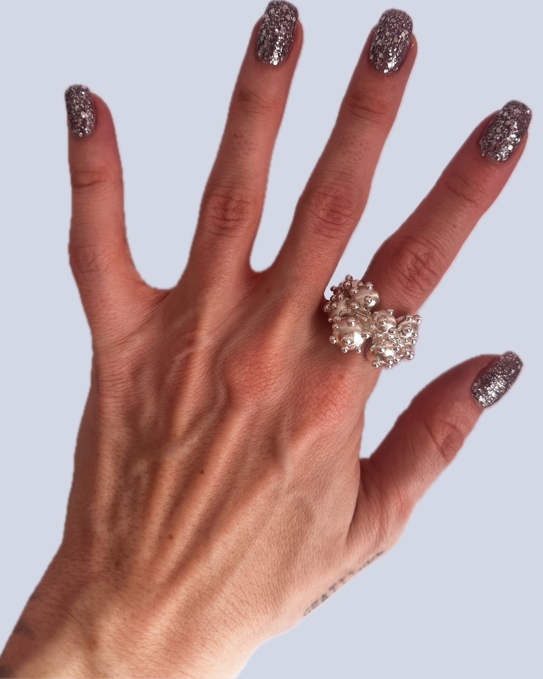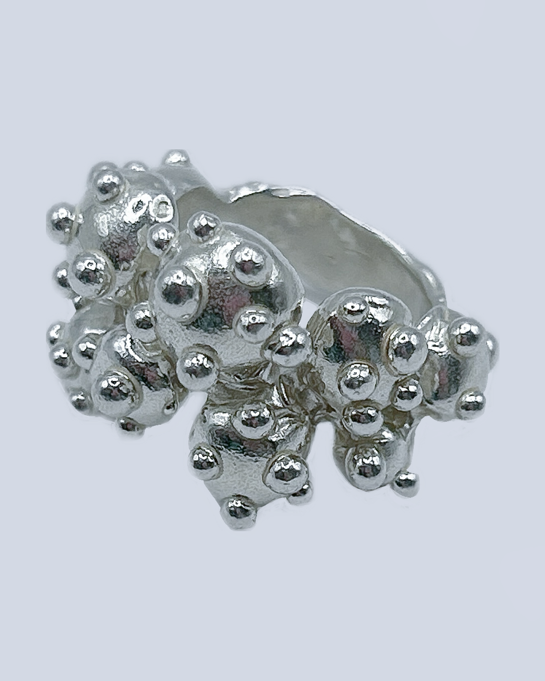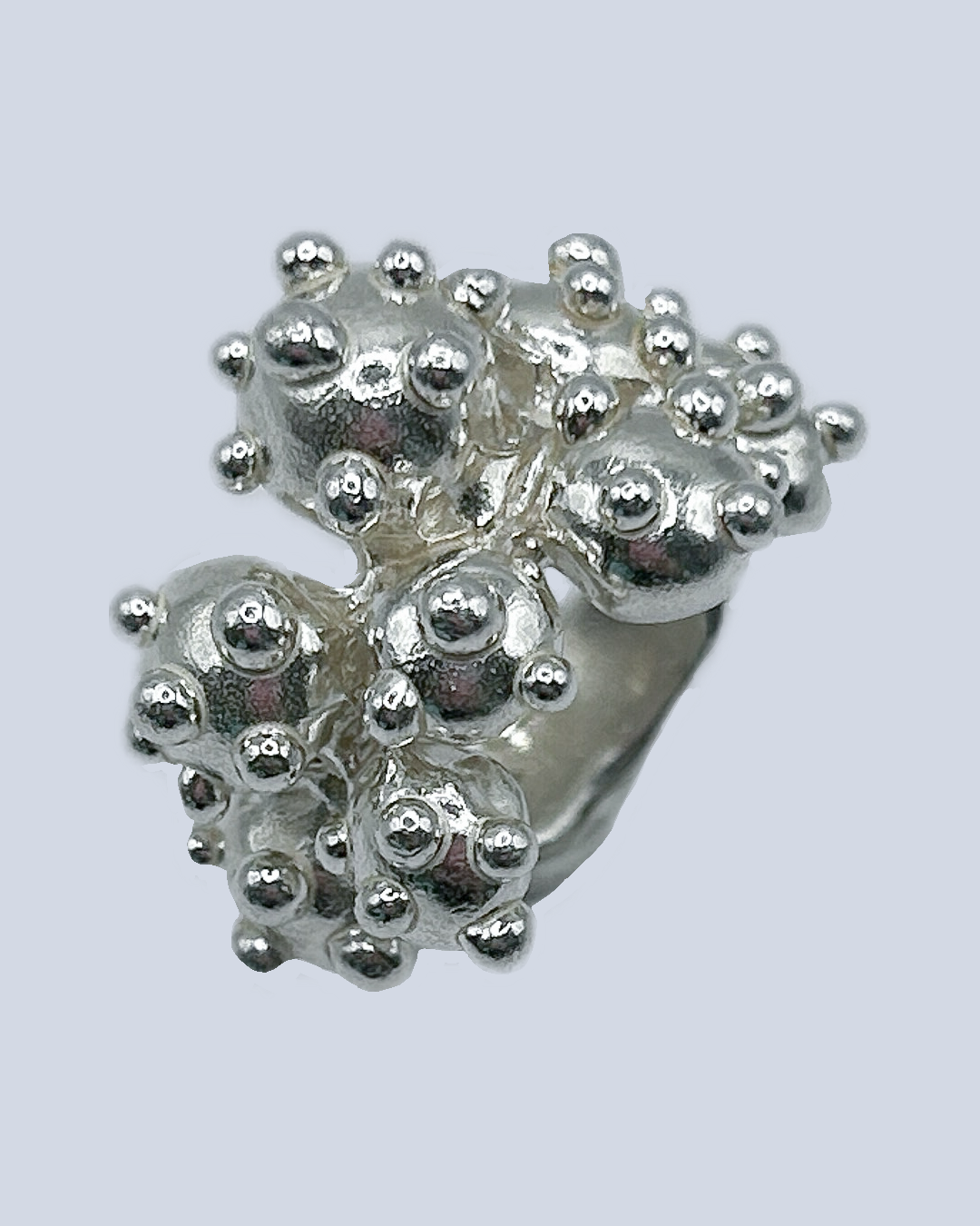 This solid sterling silver ring draws inspiration from the whimsical shapes of nature, featuring nine bold sculpted blobs accented by smaller droplets that scatter across the band like tiny desert blooms. Chunky yet comfortable, it has a playful, organic feel- part sculpture, part wearable art, with a lively, cactus-like charm.