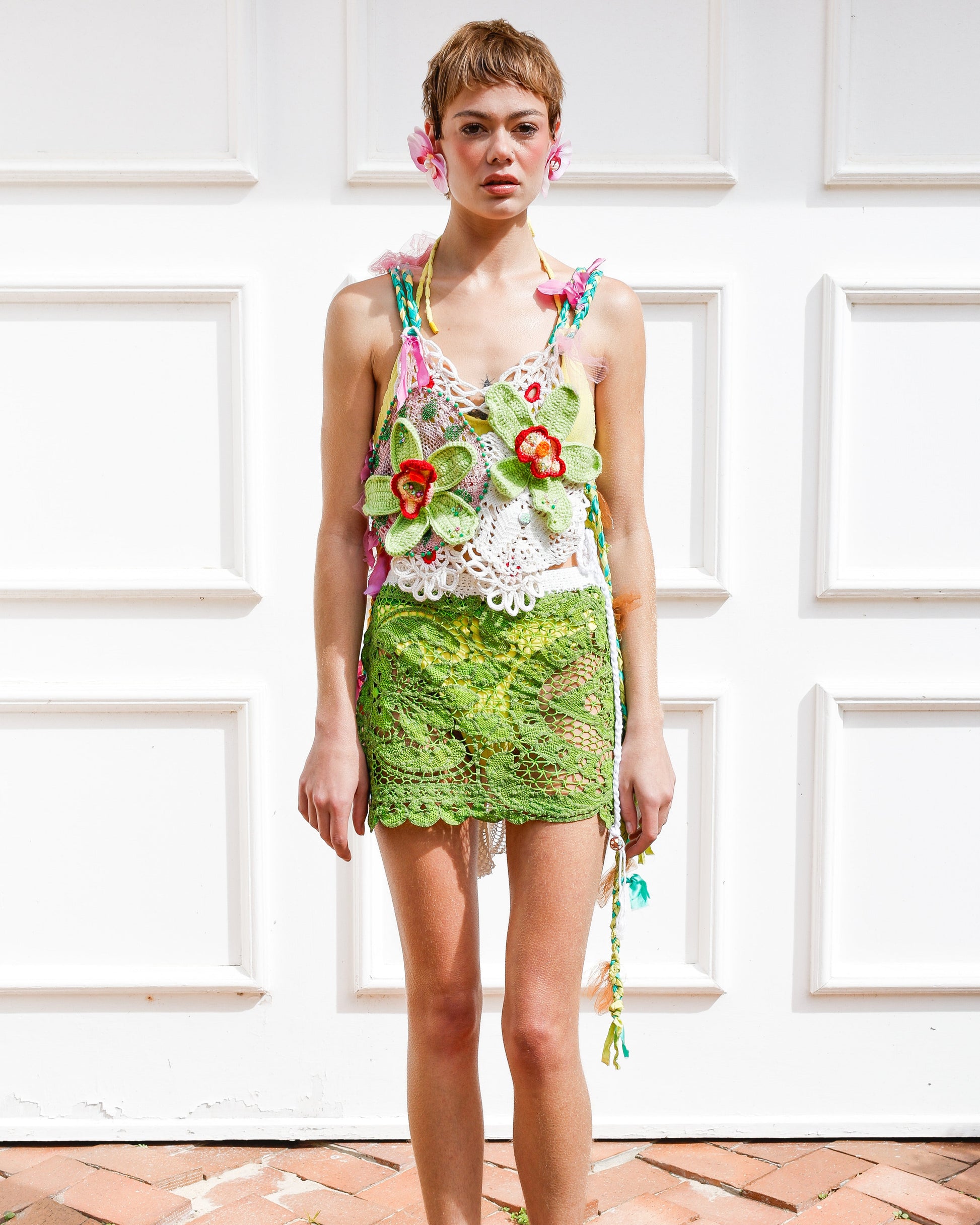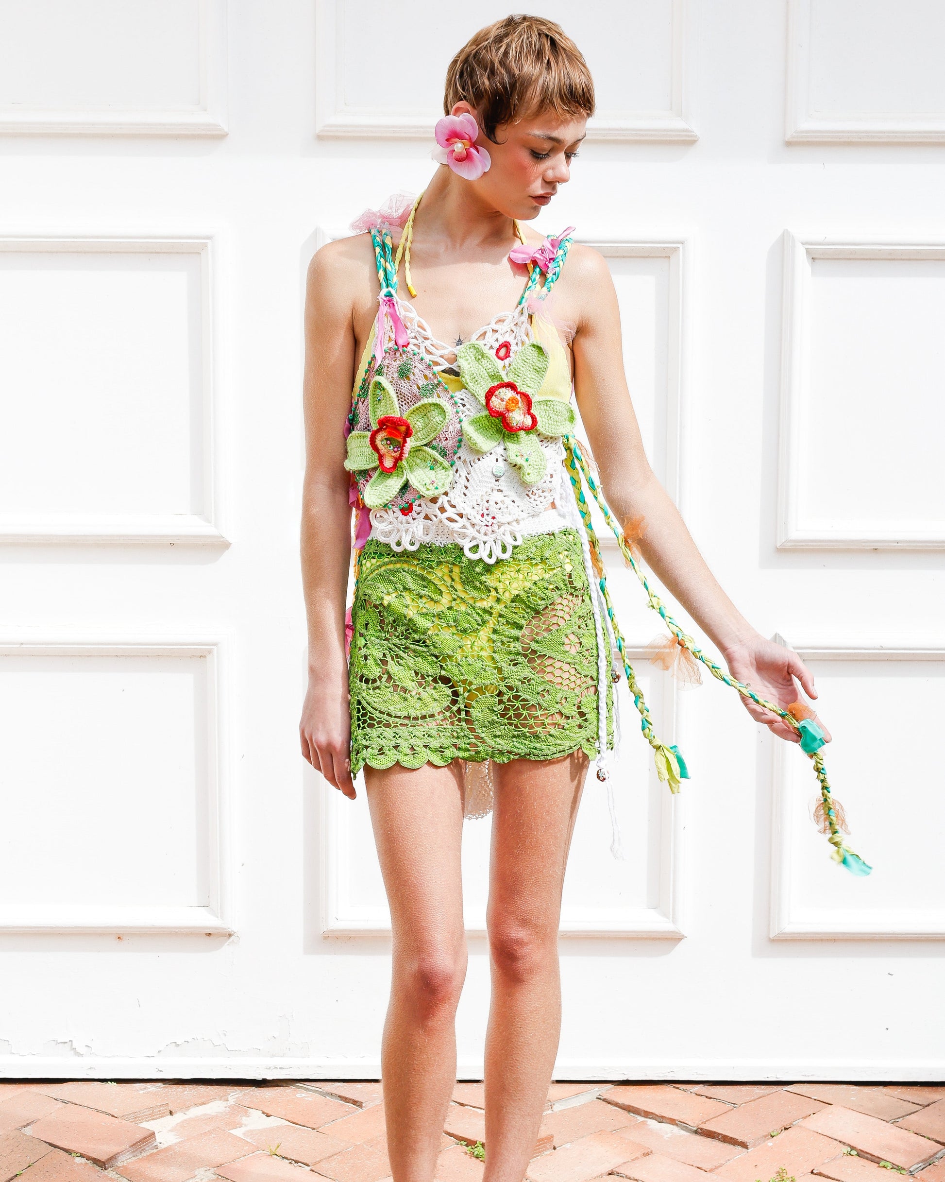 The Orchid Angel upcycled top is made to steal the spotlight! Crafted from vintage crochet, beaded crochet orchids, and tied together with plaited silk scrap fabric, it’s a playful piece that celebrates creativity and eco-friendly style.