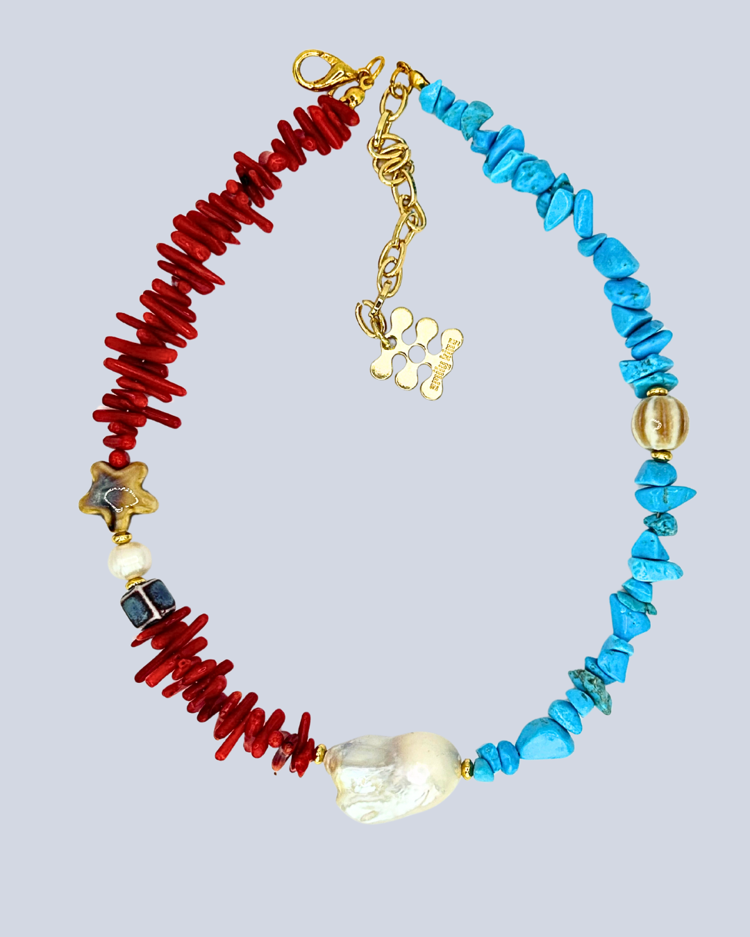 Dive into enchantment with this striking choker that blends red and blue coral in perfect harmony. A lustrous freshwater pearl sits at its heart, catching the light with every movement.